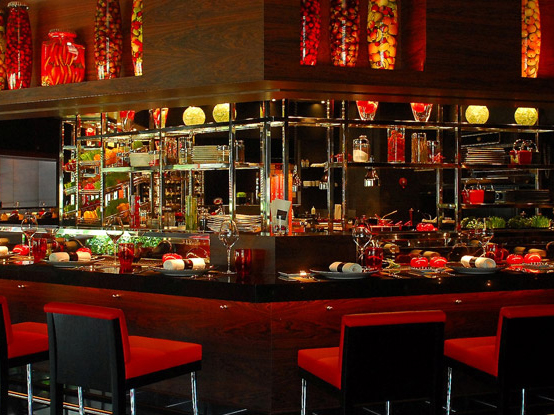 With the kitchen and dining room separated only by a counter, diners at L’Atelier de Joël Robuchon at Resorts World Sentosa are able to watch the culinary creations being prepared by the world-class chefs; and similarly, the hard-working chefs are able to see their guests enjoying their dishes from inside the kitchen. Offering an à la carte menu, four-course discovery menu, tasting portion menu, and main course menu means guests can choose what kind of dining experience – from one dish to a full meal. The dramatic use of solely black and red furnishings is balanced out by the playful atmosphere that welcomes diners to be a constant part of the action.