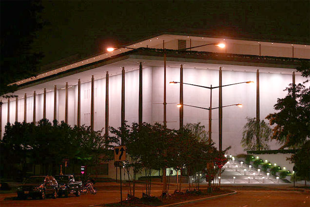 Three large theatres are inside, with smaller satellite theatres surrounding them. The Grand Foyer connects them all and is one of the world’s largest rooms. Along the ceiling are 16 hand-blown chandeliers that were a gift from Sweden