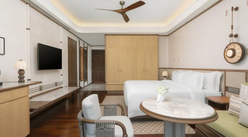 The hotel’s 336 square meters of thoughtfully designed space accommodate up to 300 guests in a range of refined categories. Options include Deluxe and Premium Deluxe rooms, spacious Family Rooms with Pool Terrace access, Deluxe Club rooms, the opulent Royal Suite with Ocean View, Junior Suites, and lavish One-Bedroom Villas with Private Pools. Each space blends classic colonial detailing with modern comforts — high ceilings, soothing palettes, and views that frame either the manicured gardens or the shimmering Gulf of Thailand.