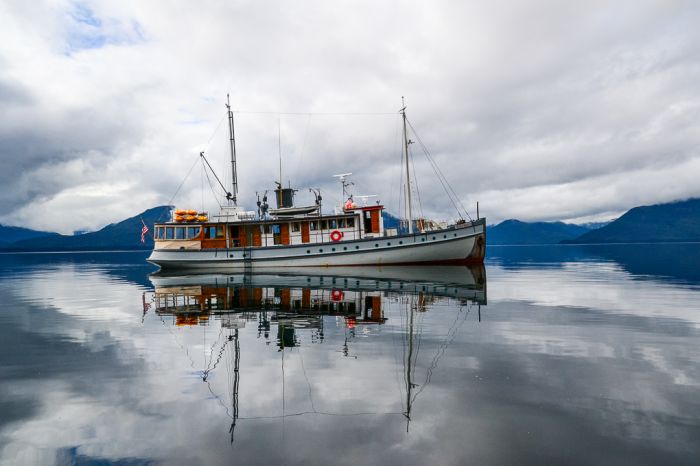 The wooden vessel I called home for seven days was the historic MV Westward. Recently renovated and equipped with her original slow-turning diesel engine, she was a sparking vessel among the many fishing boats in Sitka harbor. Built in 1924, the 86′ boat was modeled after a traditional salmon cannery tender. The rear fantail shape is characteristic of many workboats in the Pacific Northwest during that era. Originally owned by Campbell Church Sr., the Westward for many years ferried passengers from Seattle to Alaska to experience Church’s hunting and cruising expeditions. The boat has seen a who’s who of the rich and famous, including film magnate George Eastman, E.F.Hutton, Walt Disney and John Wayne. Now, the eight guests aboard will be taking in the Alaskan scenery, hiking, kayaking and viewing wildlife on a much different adventure experiencing sustainable travel.