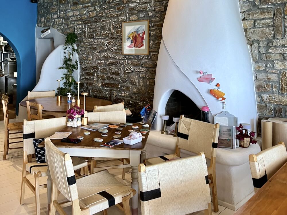 Reflecting a marine theme, overhead lampshades are shaped like sea urchins and decorative octopi are created from entwined ropes hanging from the walls. Being so close to the Aegean Sea with an outcrop of partially submerged rocks facing us and the islands of Delos and Mykonos on the horizon, my companion was inspired to say “so close, the breeze adds salts to your food.”