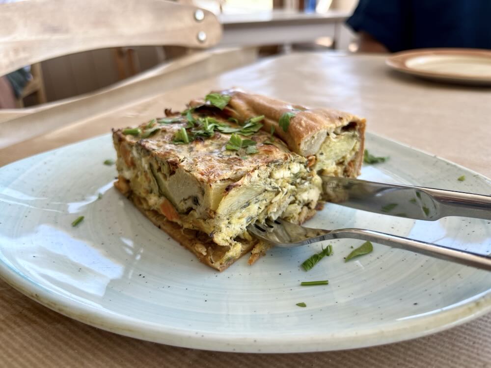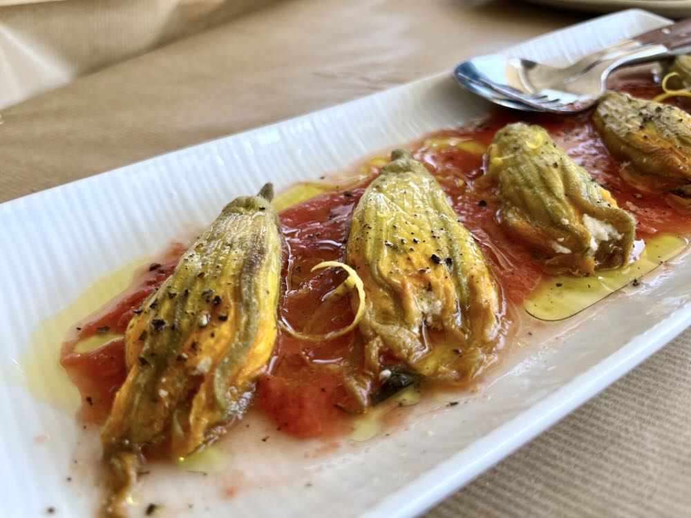 While primarily a seafood menu, there is also an impressive mezze of vegetable dishes. My companion and I decided on starters of traditional island delights, soft zucchini flowers and a generous portion of artichoke pie.
