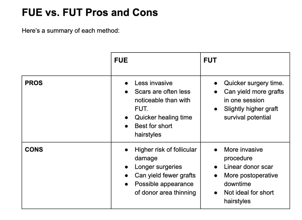 Generally, FUT causes minimal or no transection of grafts, preserves follicular units, and yields a higher number of grafts, promoting higher survival rates of hair and quality results.