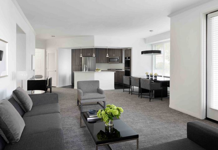 Located in the heart of Beverly Hills, AKA provides luxurious spacious residential apartments paired with hotel services and amenities close and walkable distance to shopping, dining and salons. AKA Beverly Hills houses one and two-bedroom suites, penthouses and townhouses ranging in size. Residences include big gourmet kitchens with wood floors, a huge fridge, microwave, oven, dishwasher and cupboards full of plates, utensils and cookware. The kitchen flows into the living and dining areas in an open floor plan with some units housing a fireplace and patios with views of the Hollywood sign. Furniture is selected to perfectly fit each unit with made to order furnishings from Italy. There is also a washer and dryer, bedroom with second television, huge beautiful bathrooms with showers and soaking tubs and a big walk in closet.