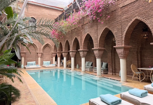 Breakfast at La Sultana Marrakech is truly a feast for the senses, and a moment to savor each morning on-site. Set around the hotel’s stunning central courtyard pool, mornings unfold slowly and beautifully, with sunlight filtering through palm trees and vibrant, beautifully colored bougainvillea cascading throughout the space, adding a striking pop of color at every turn. Tables are filled with an abundant spread of fresh juices, warm breads, delicate pastries, and traditional and Moroccan specialties, making it as visually captivating as it is delicious. It’s the kind of setting that encourages you to linger just a little longer, soaking in the magic of the Medina before the day begins.