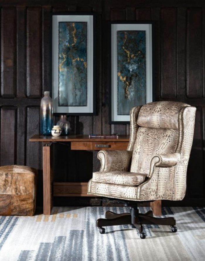 The Eloise Executive Chair features a distinctive crocodile-textured genuine leather finish, contrasting with its softly lustrous metal base to create a subtle yet striking premium aesthetic. The hand-upholstered leather surface and three-dimensional stitching details lend the chair a distinct “art furniture” presence.