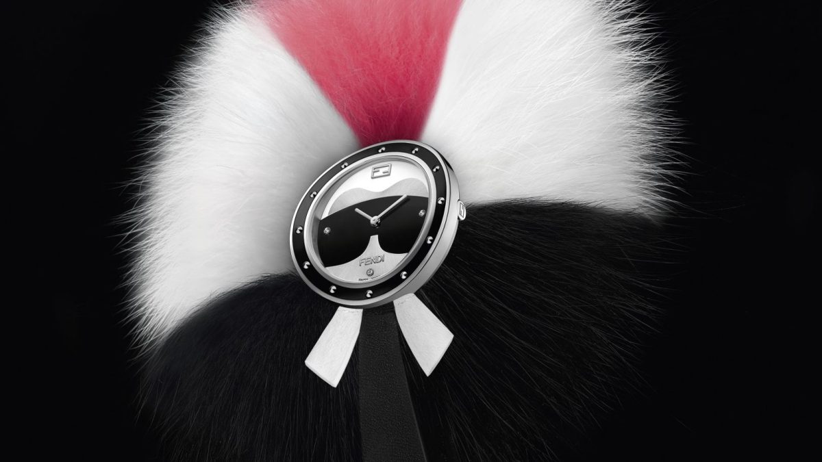 On a black, silver and white lacquered dial sits a caricature of Karl Lagerfeld posed with his iconic dark sunglasses and white mane of hair. The 35mm bezel, covered in a circle of decorative studs, surrounds the watch face, set with three diamond indexes and the Fendi insignia at the 12 o’clock hour. Alone the timepiece is a sophisticated, but cheeky way to enjoy the beauty of Fendi. For a little more fun, the Glamy fur collar can be added around the circumference of the watch face. Made from arctic fox, the fur comes in a tuft of pink, white and black to echo Lagerfeld’s uniform suits and add a colorful fauxhawk to his look.
