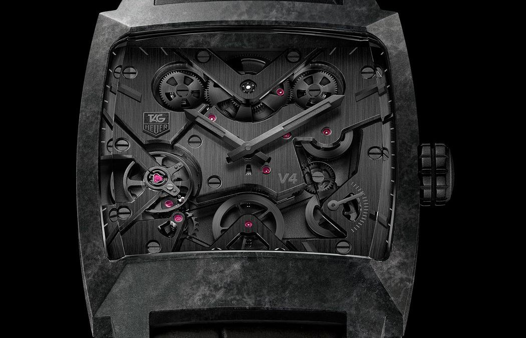 Wow. This year’s most surprising timepiece from Tag Heuer may not be their smartwatch collaboration with Intel and Google, but this matte-black piece that gives new meaning to the term incognito. This watch is black—the deep, monochromatic face almost disappears into the watch giving this timepiece its well-deserved title, the Monaco V4 Phantom. In fact the only color seen on the surface of the watch are the blood-red jewels that are used throughout the movement. It’s awesome and totally eerie at the same time.