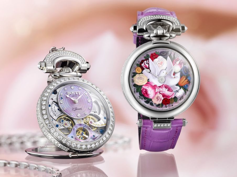 Encased in 18-karat white gold, the piece has two reversible watch faces, one with a pink-toned mother-of-pearl dial, the other features a painting of doves. The latter is a reproduction of the grand feu enamel case back of a Bovet pocket watch that was designed at the turn of the 19th century. Set with 236 diamonds (3.92 carats) on the bezel and five briolette diamonds (one carat) on the crown and strap bolt, this watch is a gorgeous complement to any lady’s timepiece collection. That is, if you can get your hands on it.