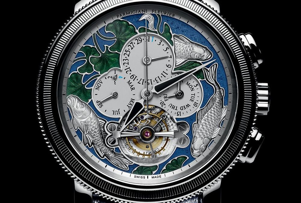 The watch is composed layer by layer, with specialty craftsmen required at each stage of the process. To begin, the engraver cuts out a scene with intricate details, curves and textures that is used as the basis for the timepiece’s aquatic theme. An enameller adds color, transparency, shading and depth to the watch face using “grand feu” enamel, before the dial is baked between 800 to 900 degrees Celsius (1,472 to 1,652 degrees Fahrenheit) to bring out the brilliant hues. Each carp is then individually sculpted and added to the completed watch face as appliqués.