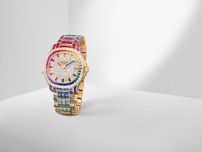 The bracelet model, Aquanaut Luce “Rainbow” Minute Repeater Haute Joaillerie Reference 5260/1455R-001, is set with 130 baguette-cut diamonds on the dial and the outer row of the bezel and 779 multicolored baguette-cut sapphires forming a rainbow on the inner row of the bezel, the flanks of the case, the minute repeater slide-piece and the rose-gold bracelet.
