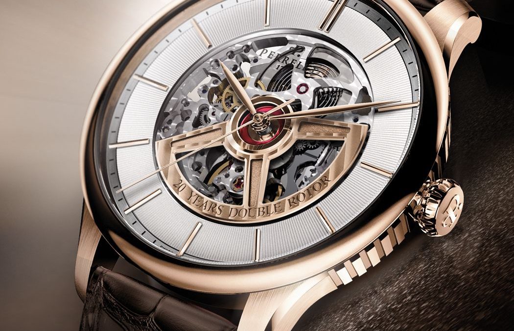 But the interior mechanics of the Double Rotor is not the only allure of this timepiece. The mechanics are finished in 18-karat pink gold with a Côtes de Genève finish and special engraving to notate the anniversary. The Manufacture Perrelet P-481 caliber even includes a ruby stone in its heart for added beauty. This anniversary-edition watch comes outfitted with an alligator leather strap, and comes in two shades with 250 pieces available in a steel version and 77 available in pink gold.