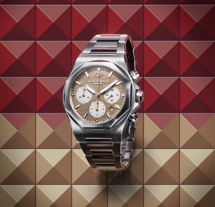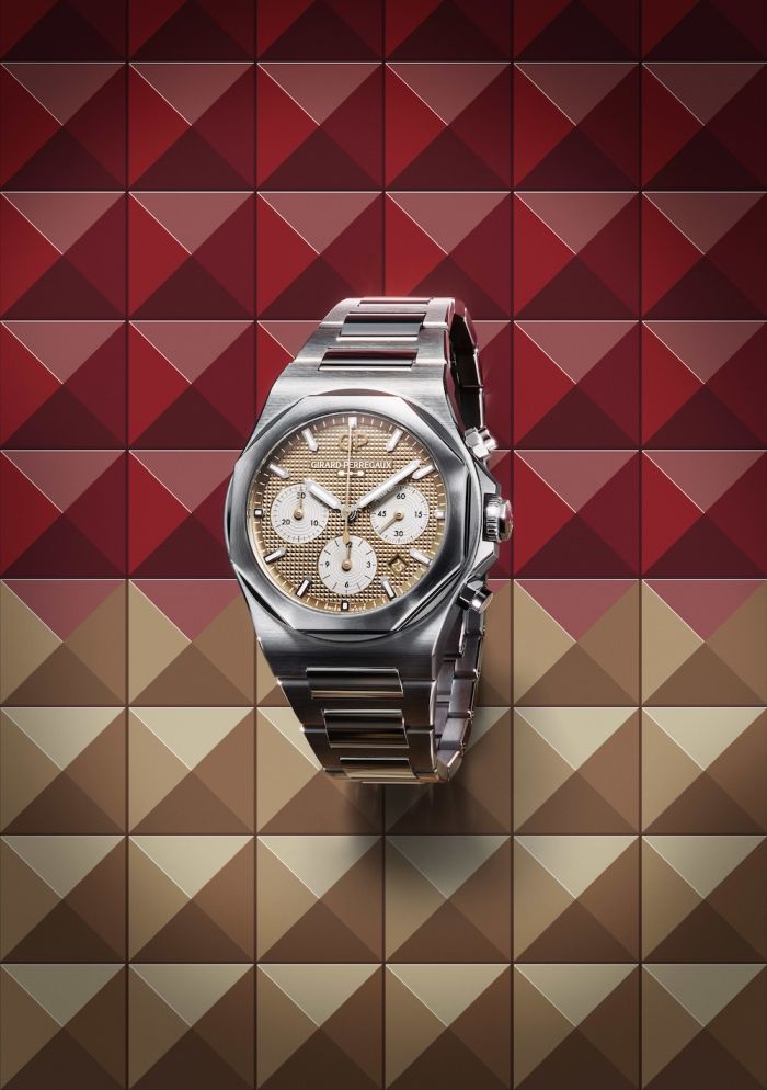 The new Wempe Signature Collection x Girard-Perregaux Laureato Chronograph is a 42mm by 12.1mm edition of the watchmaker’s well-known integrated steel-cased series. With Wempe, Girard-Perregaux has created a special copper-colored dial with a Clous-de-Paris pattern specially designed to reflect and refract light.