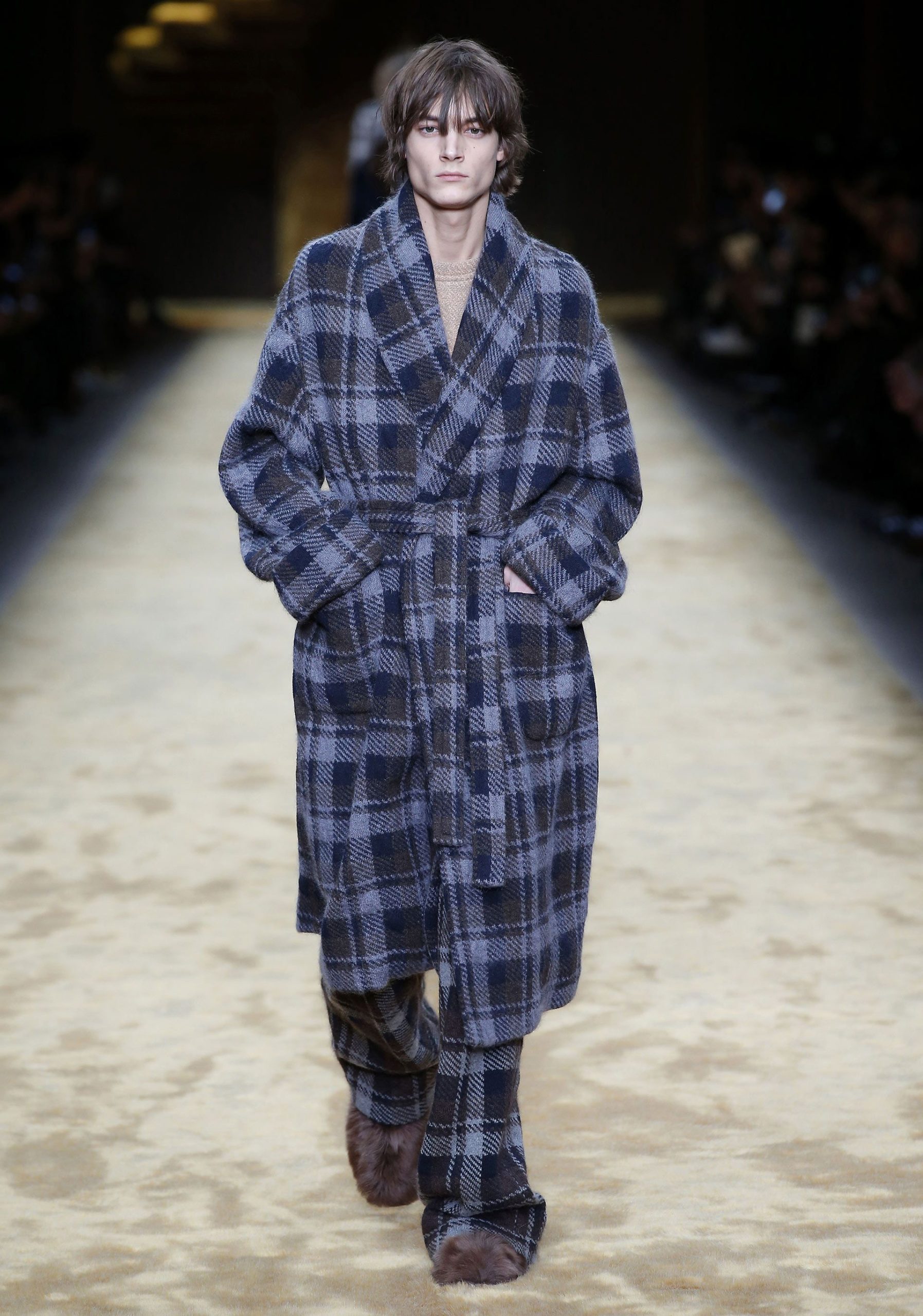 Domestic attitude was the inspiration for Silvia Venturini Fendi’s Fall/Winter 2016 collection, realized through a series of checkered bathrobes, fuzzy slippers and matching flannel sets. Models came down the shearling-lined runway in elevated loungewear—heavy robes were trimmed in fur, rich wools or layered in leather and shearling.