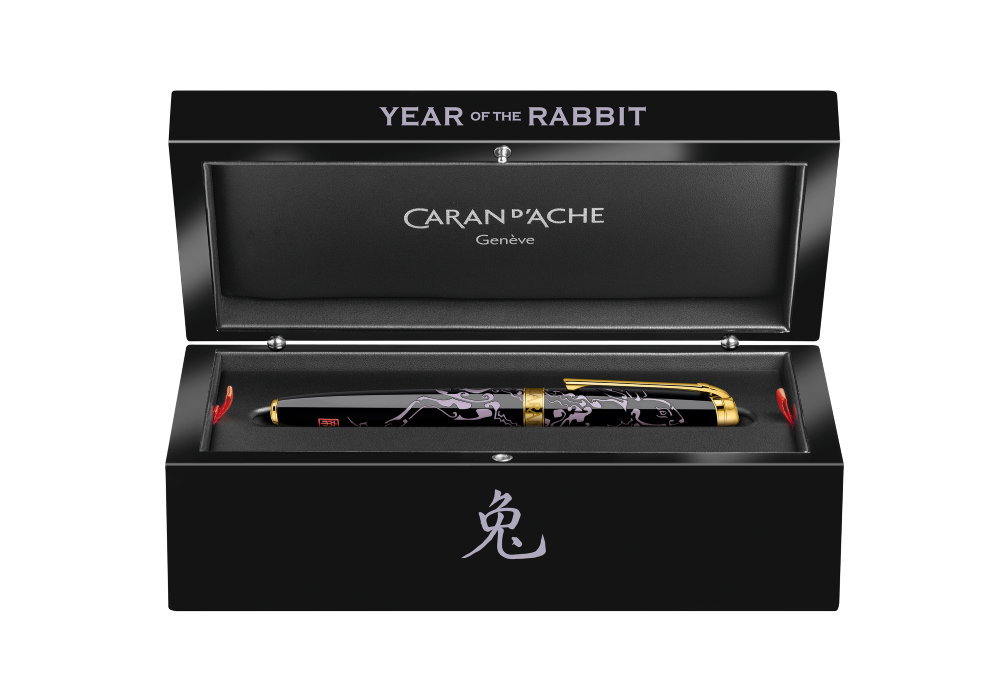 Chinese lacquer (a natural product derived from the sap of the Rhus Verniciflua tree) offers Caran d’Ache’s master craftsmen the ultimate freedom when creating incredibly intricate illustrations, without spoiling the lacquered surface. Each layer of Chinese lacquer is applied painstakingly by hand by Caran d’Ache’s experts, and carefully completed over 12 whole days of work. The calligraphic symbol for the Rabbit and the red Caran d’Ache Chinese seal enrich the pens, with their nib in rhodium-plated 18 carat gold.