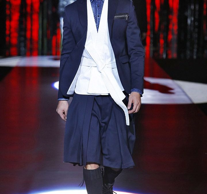 Caught somewhere between the UK and Japan, DSquared2’s Fall/Winter 2016 collection at Milan Fashion Week: Men’s was an eclectic mix of what designers Dean and Dan Caten have coined as #mangapunk. Wearing modernized kimonos, rock-styled kilts and oversized outerwear, models walked down the runway to the tune of Turning Japanese amidst a bamboo forest background lit up with colors of the Union Jack.