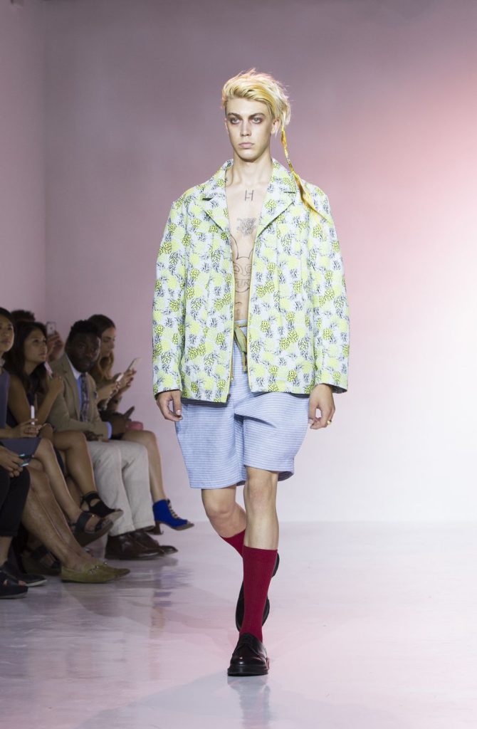 Male models with dramatic long locks and blood stains at the corners of their plump lips walked in pieces that contrasted alarmingly with their pale pallor: palm tree print shorts paired together with loose ribbed grey knits and maroon evening socks were worn with evening shoes. The clothes seemed put together at the last minute, with un-tucked cotton shirts and hastily-clasped together shorts, held only by a braid of rope, as though the vampire surfer dressed in the dark. Come to think of it, these guys can’t be in the sun, so it makes sense.
