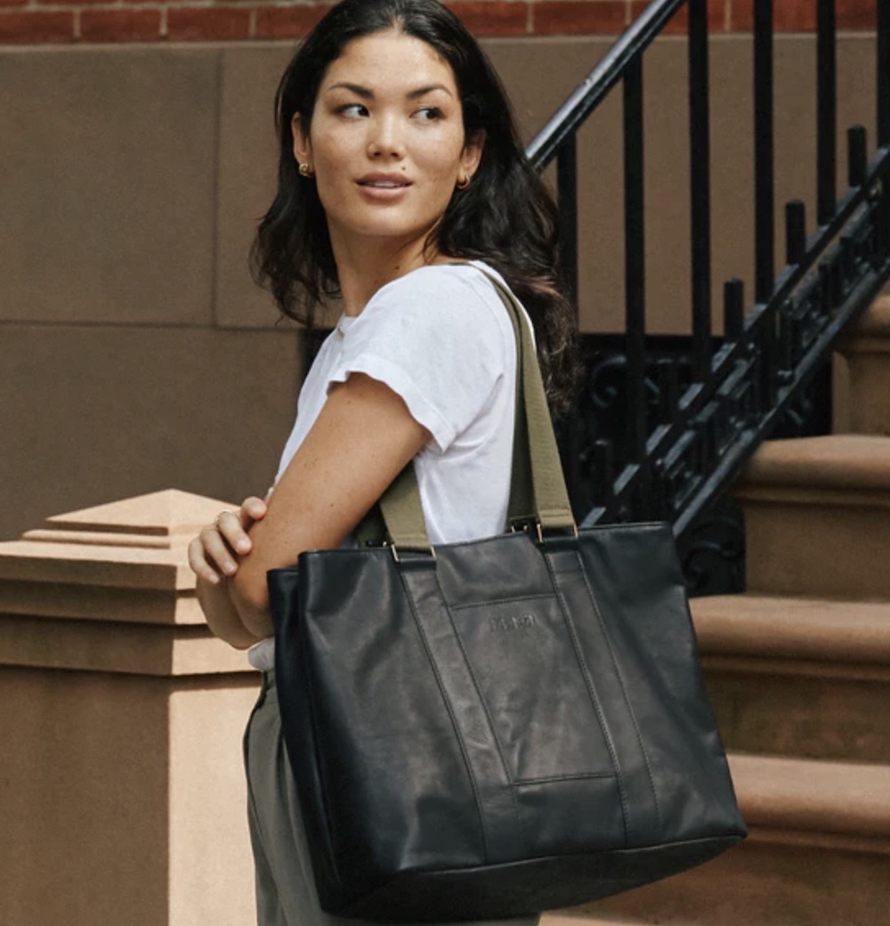 The large, yet non-bulky Leather Work Bag by FEED comes in classic black and almond brown leather and is perfect for those who continually fumble for keys, sunglasses, hand sanitizer, etc. The go-anywhere bag was designed with real customer input, for the woman on the go. Stylish, classic, and functional, this bag easily goes from work to park dates to city errands to weekend getaways. A middle divider, key ring, and multiple zipper pockets makes it nearly impossible to lose items.
