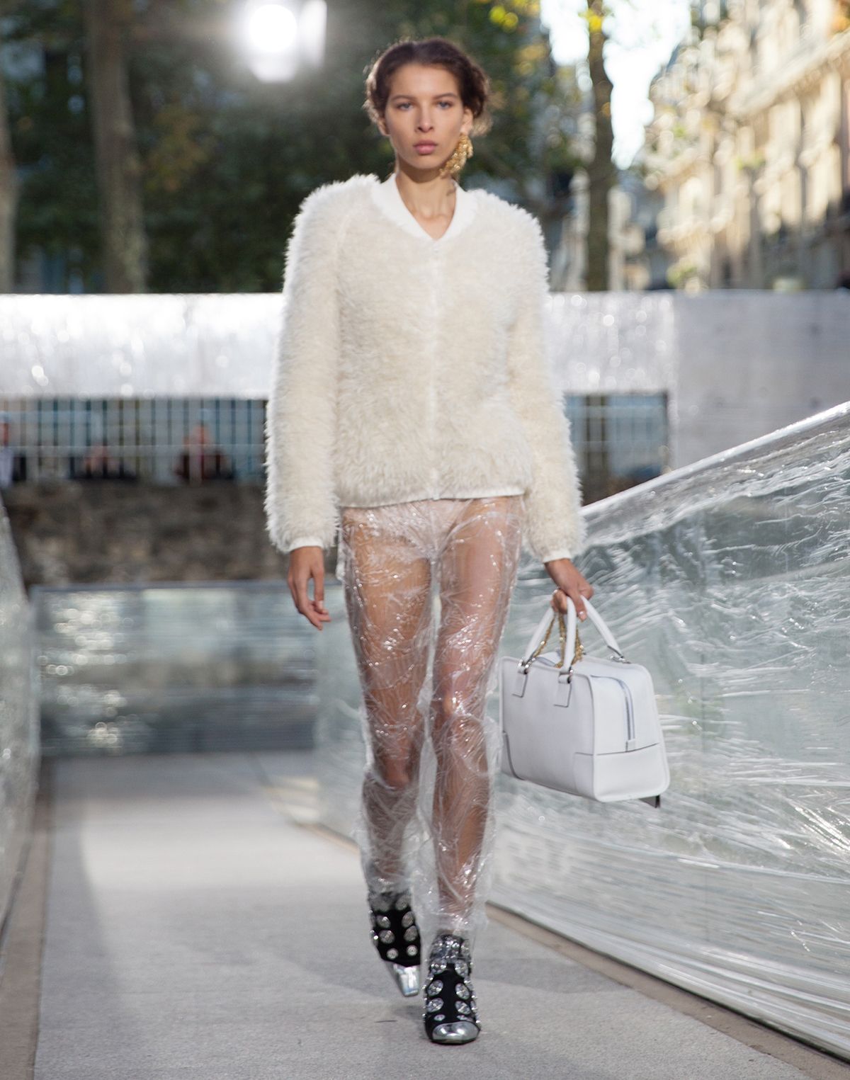 Textures and unconventional materials have been taking over the runway at Paris Fashion Week, but none were as unexpected as the funky designs at Jonathan Anderson’s Loewe Spring/Summer 2016 presentation. The designer prefaced the show by stating that his intention was to create tension in the collection so the pieces felt “more real, less precious.” And that’s exactly what he sent down the runway today—models walked in paper sweatshirts, plastic-wrap pants and a series of eye-catching accessories.