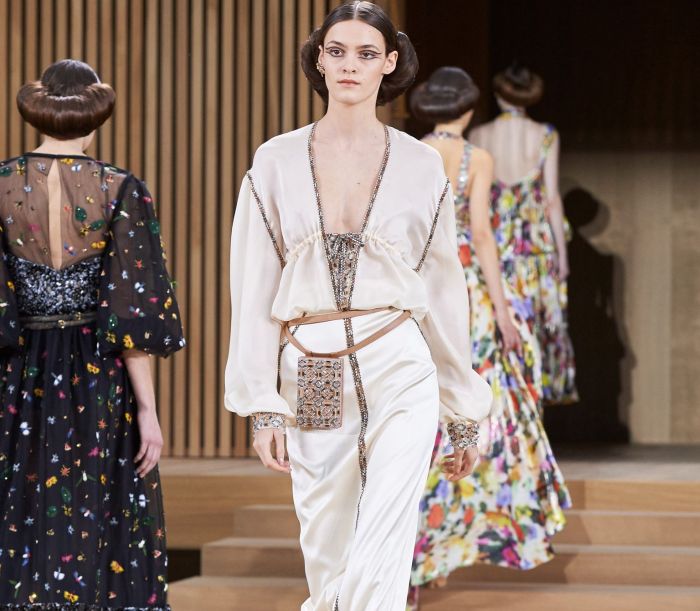 “Everything is about ecology, but it’s never done in a very luxurious way,” Lagerfeld explained backstage. “I liked the idea to take ecology one step further and to make a high fashion, very elegant and very luxurious version of it.” Wood chips, straw, twine, raffia, cork and a number of natural fabrics like cotton, linen and organic woven yarn were transformed into recognizable Chanel designs. Wood was turned into beading and embroidered onto everything from suits to evening wear. Frills and collars were made with recycled paper and raffia.