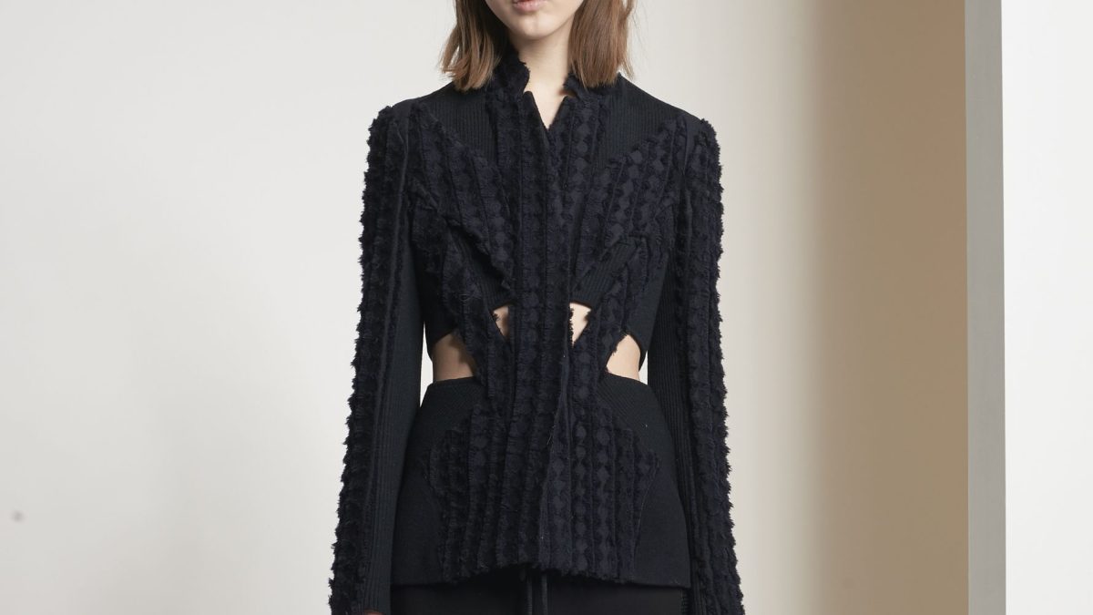 The overall effect may have been too subtle. Most of the looks in the collection range from simple slim-cut trousers to A-line dresses. For the most part there’s not much depth or character, but a few stand out pieces included a high-shoulder, structural red overcoat; a thick, kimono-style, belted wrap coatdress; and a texturized black blazer with an elaborate cut-out center and overlapping straps. Had he developed these pieces into a full line, it would have felt more substantial.