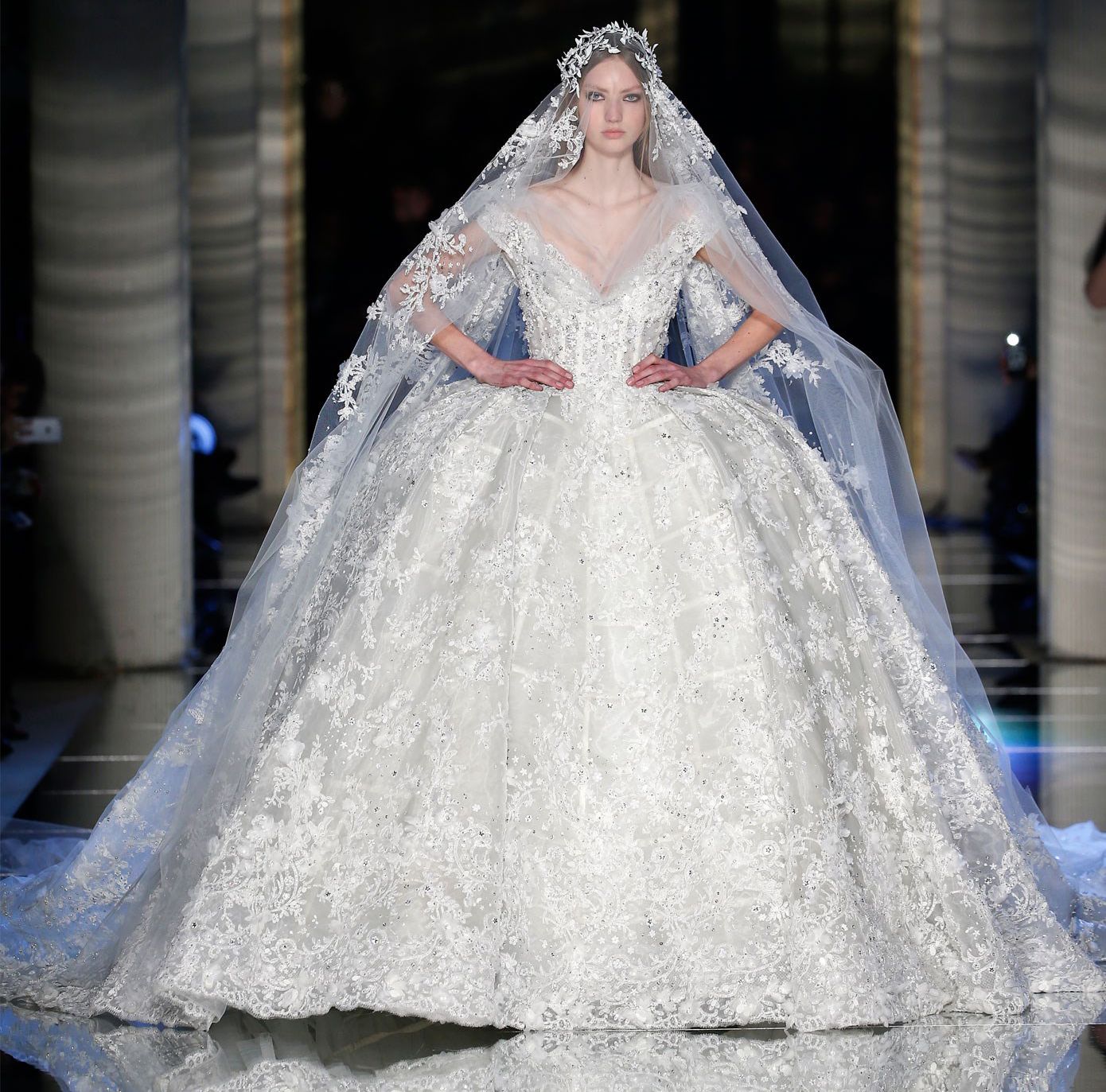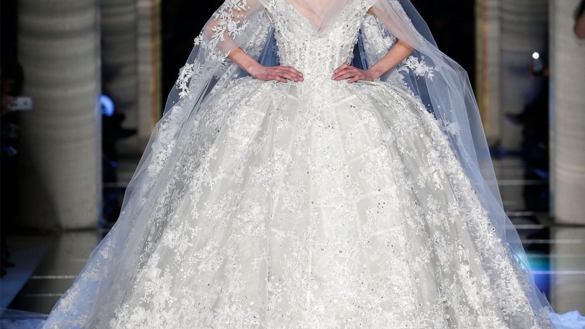 Of course, the Murad princess isn’t as innocent as her Disney counterpart. Slits were cut thigh-high, necklines plunged down the front of gowns and sheer bodices left very little to the imagination. Despite the demure references to historical silhouettes like puffed sleeves, boned corsets and hip bustles, the collection felt modern. Dresses were architectural, structured to give volume and definition to the waist and hips, but done with a light hand, so it felt soft and romantic. The only exception was an over-the-top, wedding gown with a 13-foot train that was so dramatic, one could easily imagine Cinderella marrying her Prince Charming in it.