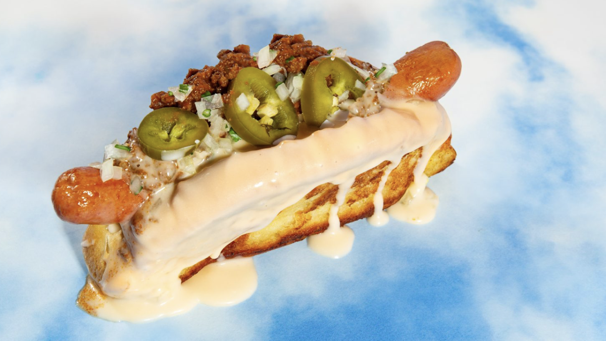 Choices include a vegan MALIBU DOG with a glass of HEIDSIECK & CO. Brut “Monopole” Vallée de la Marne, Champagne NV for $44. This dog is made with field roast 'sausage', avocado, roasted cherry tomato, pickled onions and a drizzle of garlic aioli.