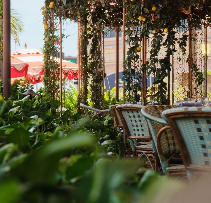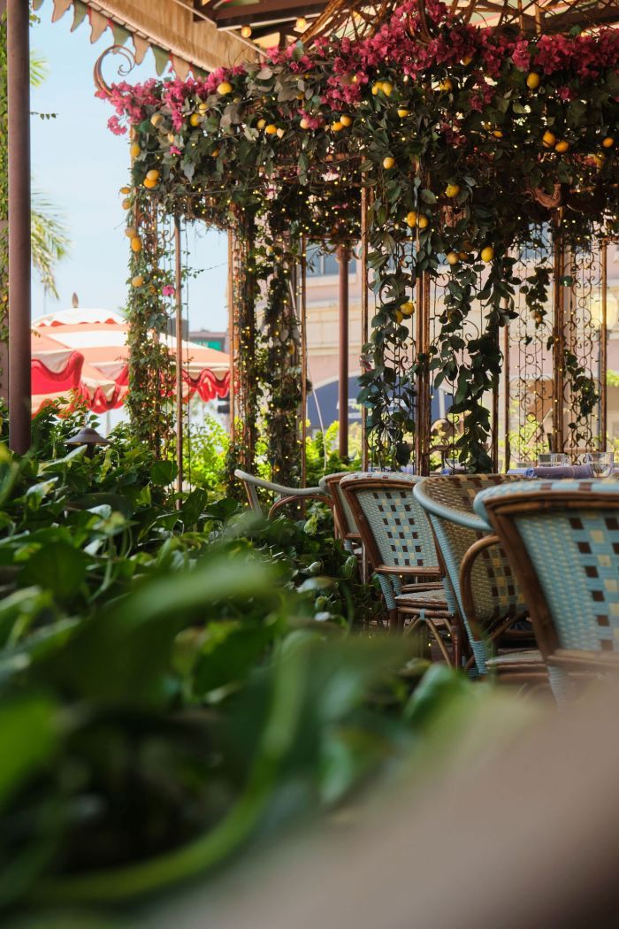 For alfresco dining, request a coveted table on the beautifully designed, pet-friendly patio filled with plants and flowers hanging from a trellis above along with illuminated trees contributing to the stunning setting.