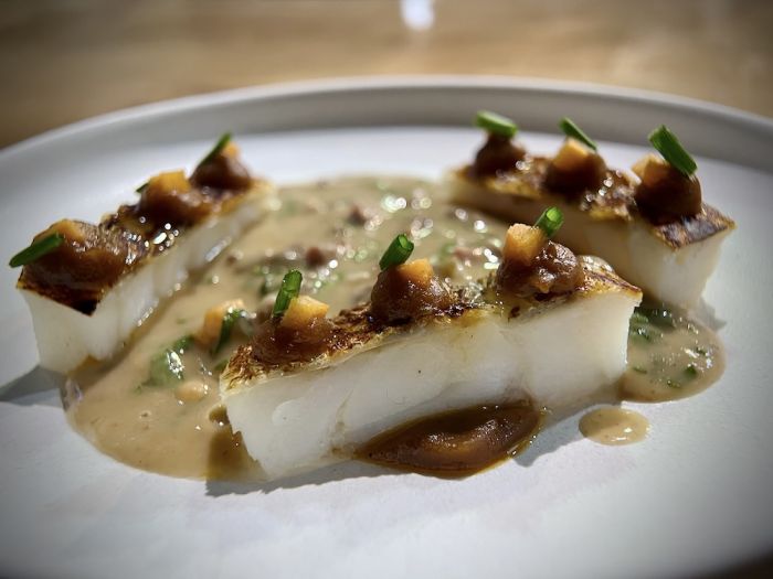With the restaurant named after Portugal’s most popular fish, cod (bacalhau), it was inevitable this cold-water variety would make its appearance. And it did, with its skin deliciously crispy, cooked in a garum sauce of carrots, beans and chorizo.