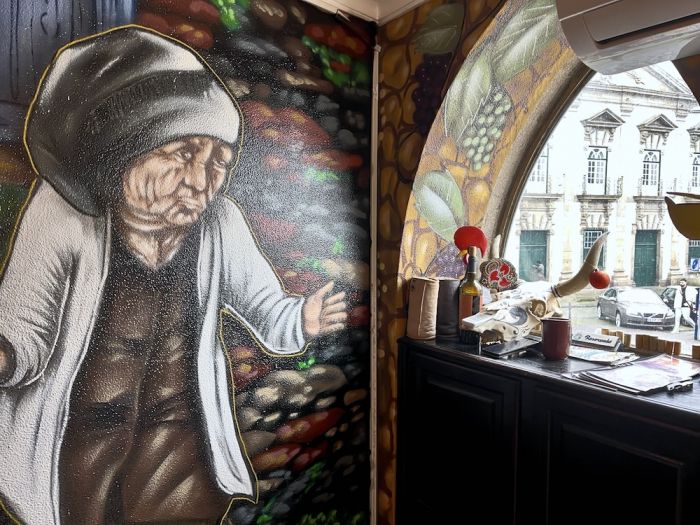 Adding charm to the occasion, the chairs my companion and I sat on were designed by staff members, with ones painted with the letters RIP and LIP (‘Dine in Peace’ and ‘Lunch in Peace’). Colorful wall murals surrounded us, the work of Eky One, a talented Porto artist.