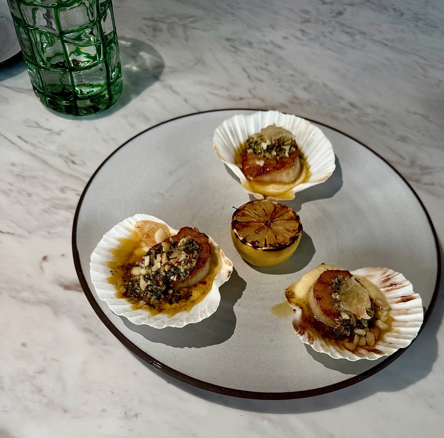 Cooked seafood items on the menu include Maine Diver Scallops served in shells with an orange cauliflower puree and an oro blanco citrus sauce. Each scallop is topped with a garden herb gremolata and toasted chopped macadamia nuts.