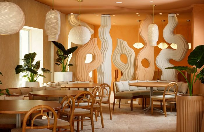 The restaurant and its décor are exactly what first-time SoCal visitors might imagine of the region. Just steps from the sea, it’s got that easygoing Santa Monica energy—elevated, but not at all stuffy. An al fresco patio overlooks the hotel’s pool and the nearby beachy expanse. Inside, a carefree aesthetic includes woven fibers, earth toned linens, and soft illumination from clay pendant lamps handcrafted in Oaxaca. Designer Gulla Jónsdóttir clearly desired the space to feel grounded yet slightly ethereal. Her mission is well accomplished.