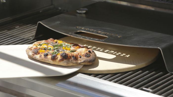 The KettlePizza Gas Pro is a pizza oven kit for propane and natural gas cooking grills. The unit creates a cooking chamber that focuses the heat into a small space which is great for getting the tops of your pizzas brown and properly cooked. The KettlePizza Gas Pro is intended for grills with at least three burners and a minimum cooking area of 24 inches wide by 17 inches deep. Just place the Gas Pro enclosure and stone onto your grill surface, allow it to adequately heat up (about 20 minutes for the chamber and stone) and start cooking pizzas!