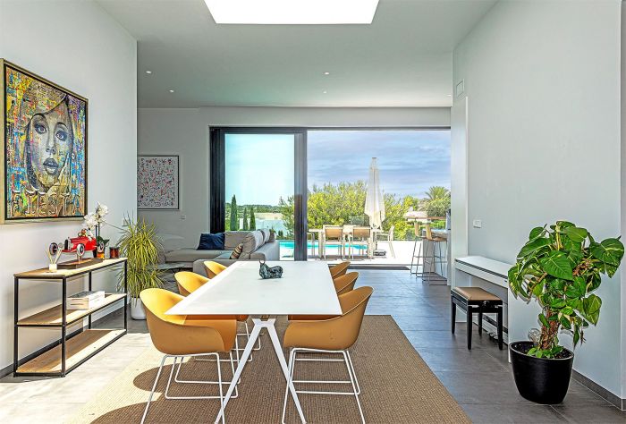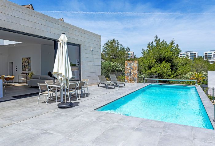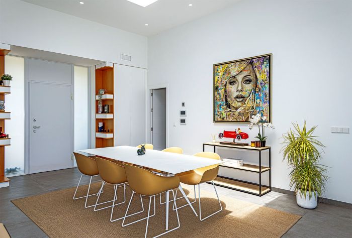 From the moment you step through the custom-designed entrance, you’re greeted by a sense of volume and vision. The villa features expansive ceiling heights over 3.5 metres, a fully opening oversized skylight, and a flawless connection between interior and exterior through floor-to-ceiling glass walls that open to a private swimming pool.