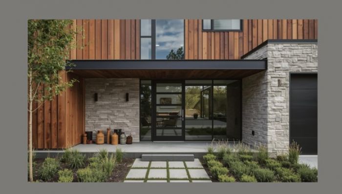 The most dynamic contemporary facades embrace contrast. Combining warm timber with cool steel, rough stone with smooth glass, or matte black metal with polished concrete creates visual tension that elevates the overall composition.