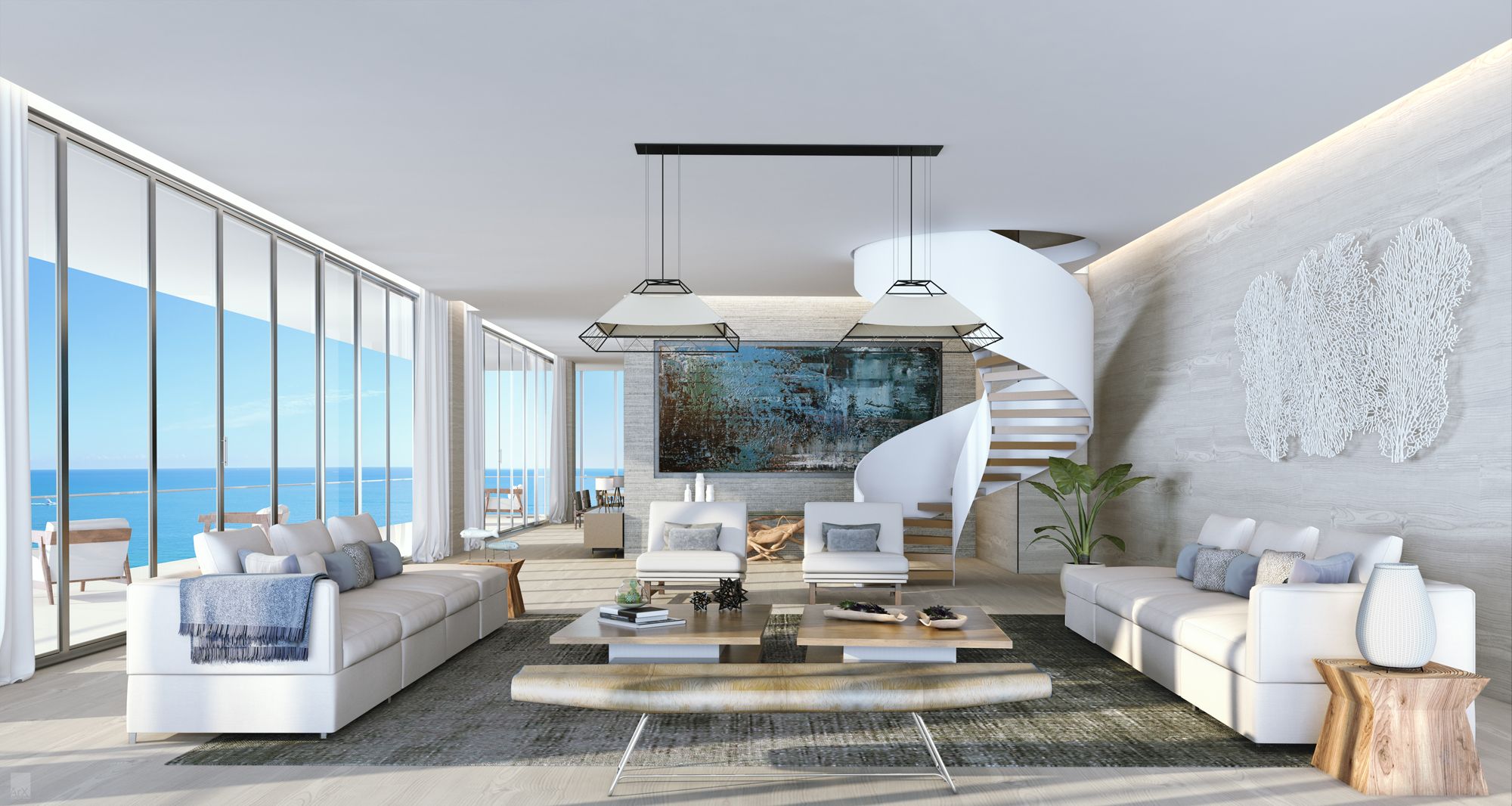 Based on the photos, the penthouse has a pretty cool spiral staircase in the living room, as well as sea-inspired design elements like a coral wall hanging. Spread across two towers, the building’s amenities feature several swimming pools, restaurants, a spa and fitness center, entertainment rooms for kids and teens, cigar lounge, wine tasting events in a dedicated salon, business center and a Club Room with billiards and various gaming tables.