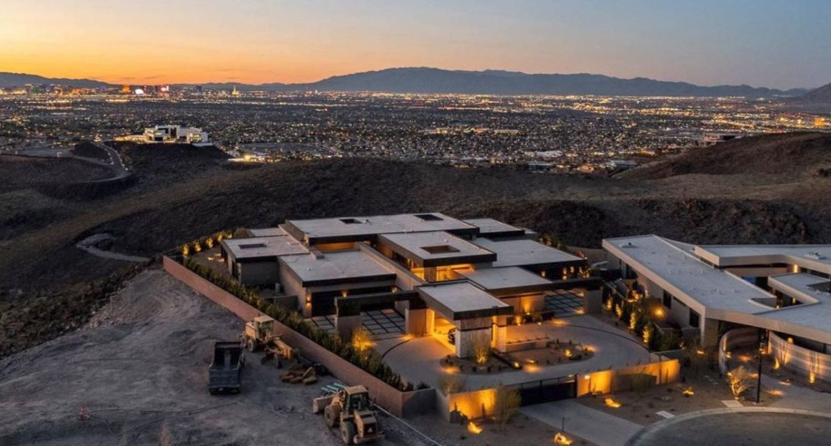 The privately gated property on a cul-de-sac set in the foothills of the McCullough Mountains has everything a retired 11-time world boxing champion could want, including a gym, trophy room, golf simulator, wine room, wet bar, hair salon, butler’s kitchen, and huge sliding glass walls adding mountain and city views to the Strip views.