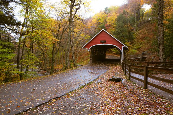 Nearby is the village of Jackson, a quintessential northern New Hampshire town. Residents know one another from childhood, and unlocked doors are not unusual. This is a place of pumpkins, apple pie, and Americana with white picket fences and flags, both modern and colonial-era. Its an ideal place to spend the afternoon or a few nights with tourist shops, art galleries, and antique stores. You’ll also see here and thought out New Hampshire its iconic covered bridges, some painted red like barns and others weathered brown, connecting roads across rivers and revealing glimpses of the region’s architectural heritage.