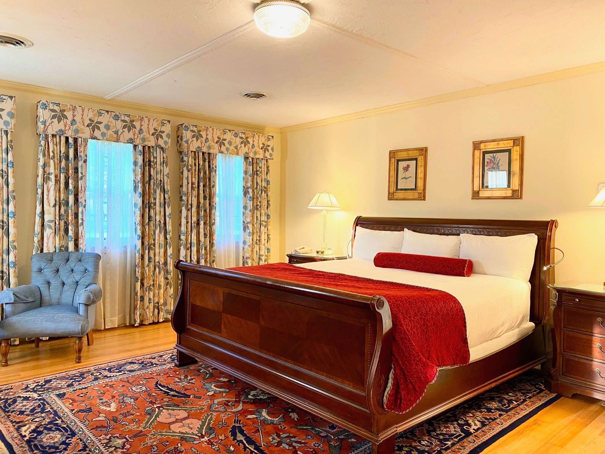 Inside, the interiors are homely yet refined. Wide wooden floors, exposed beams, and wood-paneled walls create a sense of warmth, while stone fireplaces punctuate sitting rooms and suites, offering both literal and figurative hearths for guests. Furnishings combine traditional New England craftsmanship with modern comfort, from upholstered armchairs to carefully curated rugs, giving rooms a lived-in, welcoming feel. Several suites feature private hot water jacuzzis, ideal for warming after a day spent hiking in the White Mountains or skiing nearby.