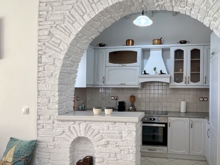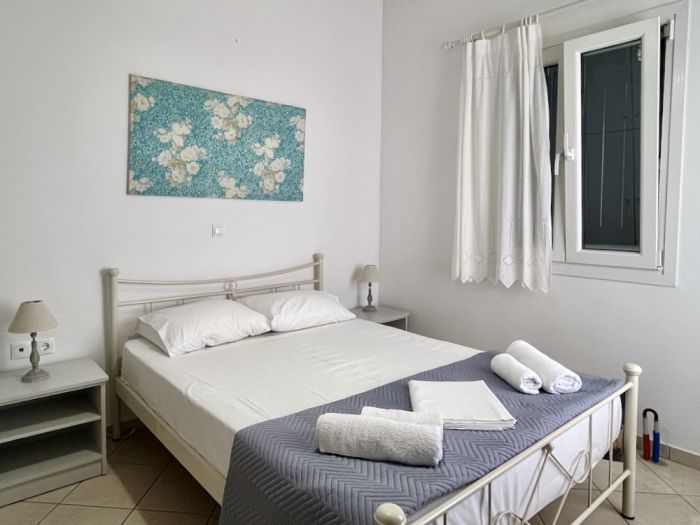 The bedrooms are accessed through a curved archway, one having two single beds with a charming painting of cherubims adorning the wall and books on shelves. Open the curtains in the second bedroom, which features a kingsize bed with metal bedstead, a floral design painting on the wall and an intricately designed vintage cabinet, and you’re gazing directly over the patio and across to the Aegean Sea and islands.