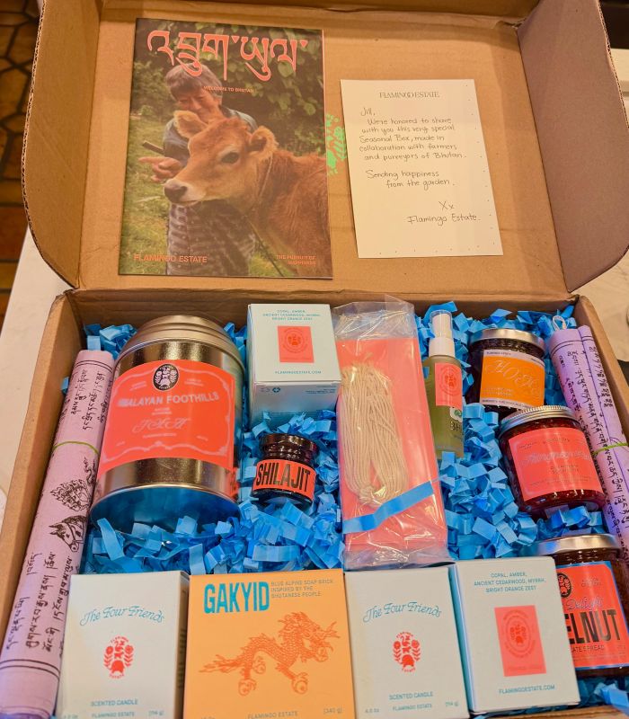 The Tribute to the Kingdom of Bhutan box from Flamingo Estate celebrates the customs and culture of Bhutan's natural beauty, craftsmanship and soulful way of life. Inside are 10 artisan items curated by Richard Christiansen. He collaborated with local farmers and artists to highlight their deep connection to the land. These enlightening indulgent treats that will delight even the most discerning traveler.