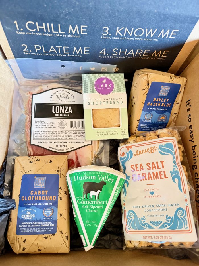 The One-time gift box includes three best-selling cheeses, three pairings, including one meat), one box of crackers, one mini gift kit + a discount for a full subscription. The cost is $125 + free shipping.