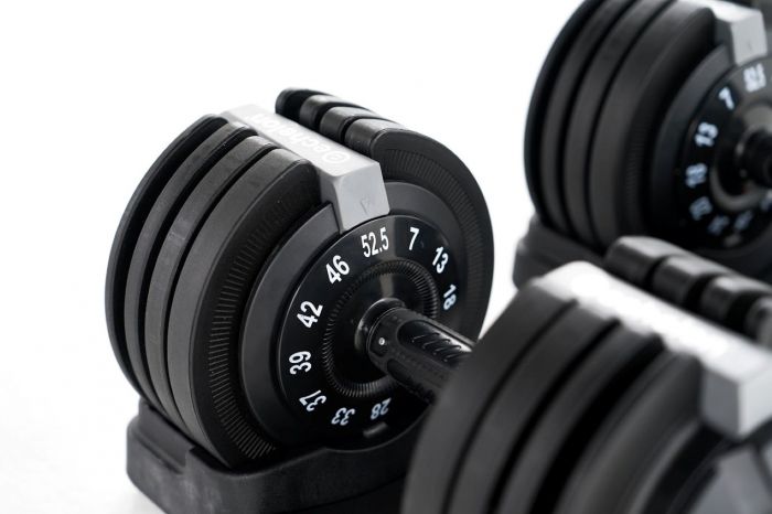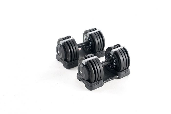 The dumbbells feature multiple weight plates in one, so when you want to increase or decrease resistance, all you have to do is simply twist a dial in the handle and a plate will be added or removed. Its compact design eliminates the need to manually add weights.