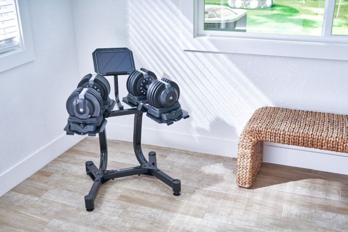 Designed to replace numerous free weights, the fully adjustable, all-in-one system allows you to change the weight fast between exercises. We love the elimination of multiple dumbbells, freeing up extra space in our workout area.