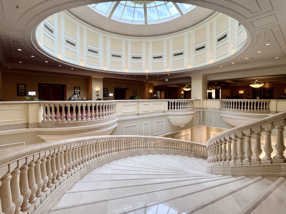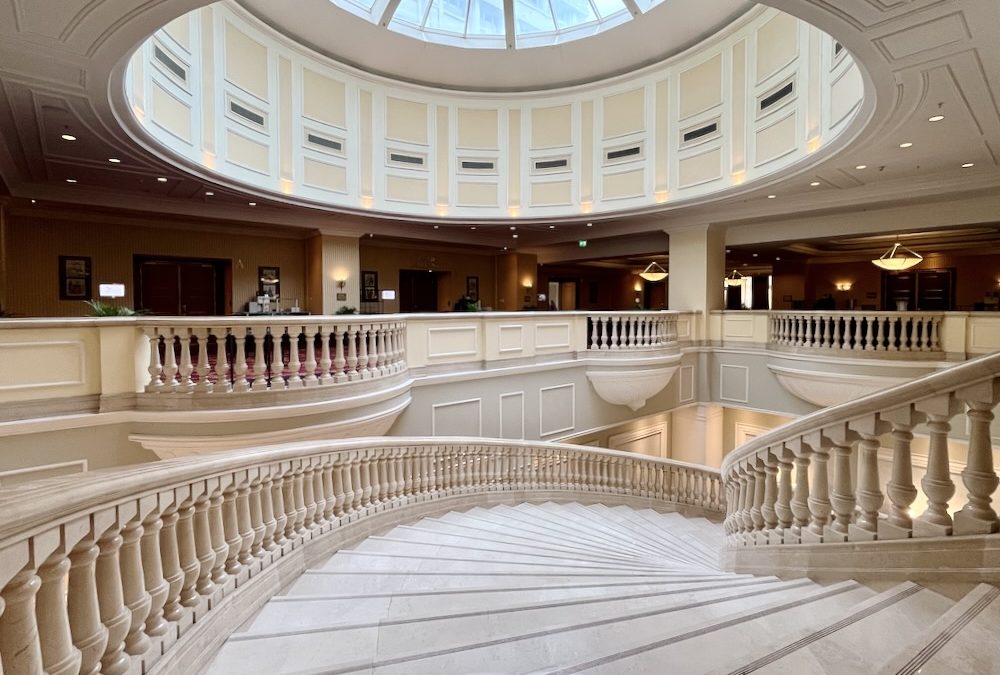 It’s the sheer dimensions of the formidable JW Marriott Bucharest Grand Hotel that capture one’s imagination – a vast double-tiered open lobby and first floor embraced by broad sweeping polished marble staircases that seem straight out of a romantic movie with two huge cupolas above cascading natural light everywhere.