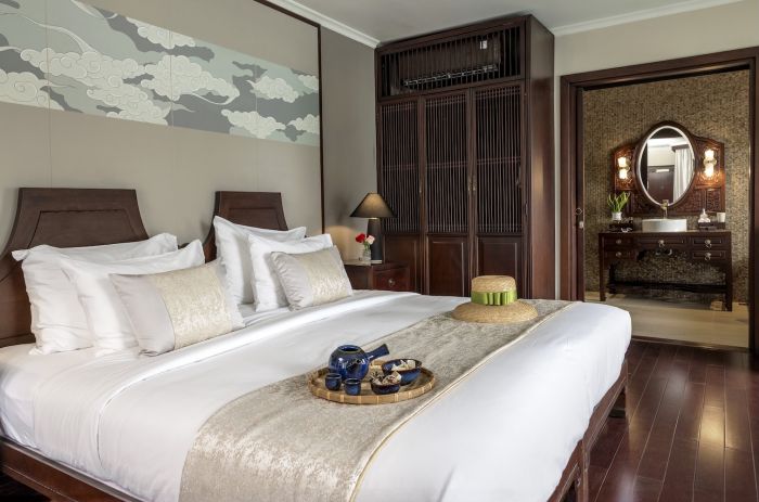 Updated interiors prioritize space, proportion, and materials, resulting in accommodations that feel closer to a private yacht or design hotel than a traditional cruise ship. Suites now feature cleaner lines, muted tones, and carefully selected textures—natural woods, tailored upholstery, and subtle Vietnamese design references, including hand-painted murals.