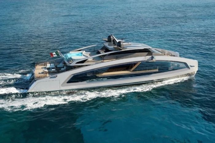 Therefore, Tecnomar draws attention to the aft beach club, where two foldable side doors and twin internal wings can be deployed to provide a 52-foot-wide swim platform.