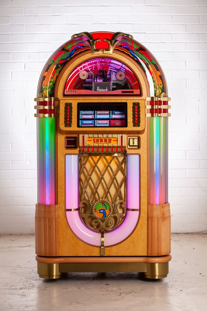 In response to the rising popularity of vinyl and love of classic design amongst their clientele, Harrods customers can now own the ultimate souvenir, an exclusively designed vinyl-playing jukebox. Brand new and entirely bespoke to the luxury brand, it features the famous bird images within the cabinet and is hand-made in the UK. Produced by Yorkshire-based Sound Leisure, which has specialized in manufacturing bespoke classic jukeboxes for over 40 years, each jukebox is hand-built by master craftsmen and women using traditional methods. Manufactured from high-quality wood, each ply formed cabinet is hand polished and adorned with brushed gold effect aluminum decorative castings, LED illumination ensures that the color of the lighting can be adjusted to suit any location.