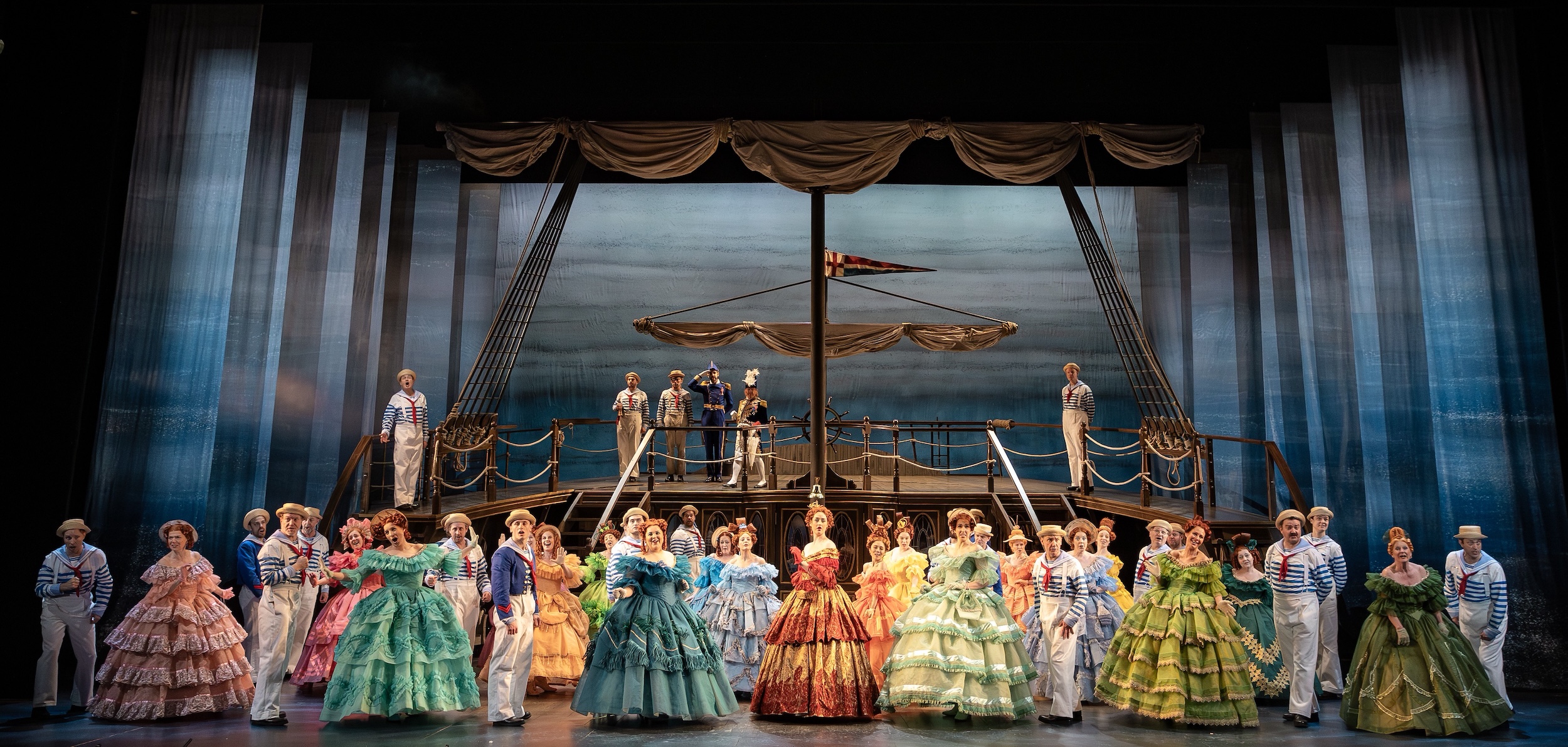 The visual world, created by designer takis, is a constant source of pleasure. The eponymous Royal Navy warship dominates the stage in a riot of colour and clever detail, its playful proportions and revolving movement lending the production a sense of perpetual motion. Billowing crinolines, crisp naval uniforms and bold, candy-hued accents create a heightened, almost storybook aesthetic — elegant yet knowingly tongue-in-cheek — that perfectly matches the opera’s mischievous spirit.