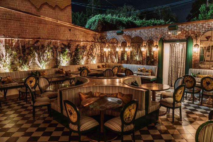 The patio is equally intimate and romantic with brick walls, cozy banquettes and alcove seating, a nice fireplace and plants and foliage.